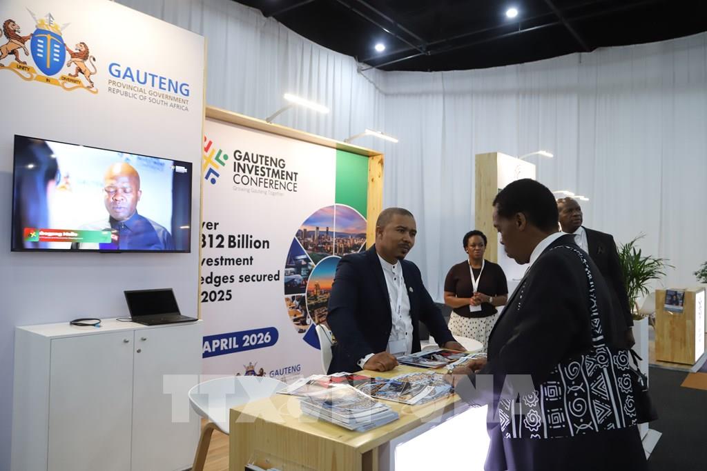 Khách tham quan tìm hiểu cơ hội đầu tư tại tỉnh Gauteng - tỉnh nhỏ nhất về diện tích nhưng tập trung đông dân nhất và giàu có nhất Nam Phi - tại Hội nghị Đầu tư Nam Phi 2026. Ảnh: Hồng Minh - p/v TTXVN