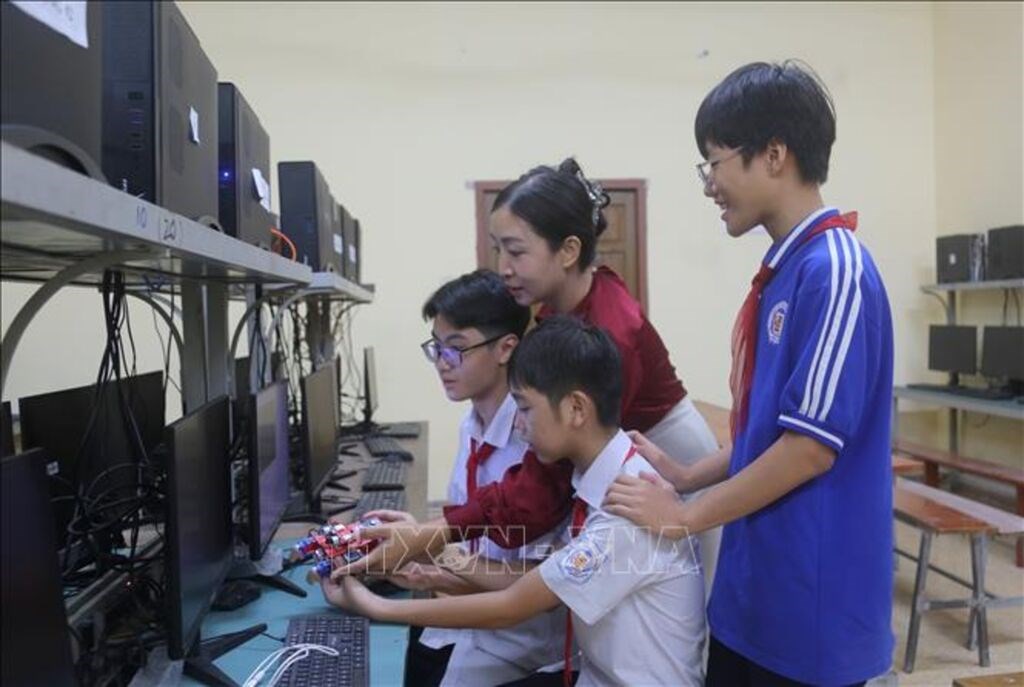 Cô Đỗ Phương Thúy, giáo viên Trường THCS Lương Khánh Thiện (Hải Phòng) hướng dẫn nhóm học sinh viết lệnh điều khiển robot. Ảnh: Minh Thu - TTXVN