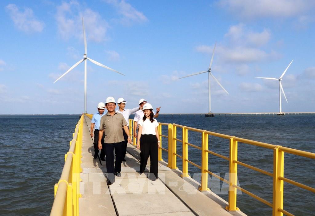Lãnh đạo Sở Công thương tỉnh Vĩnh Long khảo sát tại Nhà máy điện gió số 3 tại vị trí V1-3 (Nhà máy điện gió Duyên Hải) trên địa bàn phường Trường Long Hòa, tỉnh Vĩnh Long. Ảnh: Phạm Minh Tuấn-TTXVN