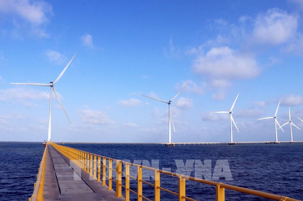 Nhà máy điện gió số 3 tại vị trí V1-3 (Nhà máy điện gió Duyên Hải) trên địa bàn phường Trường Long Hòa, tỉnh Vĩnh Long. Ảnh: Phạm Minh Tuấn-TTXVN