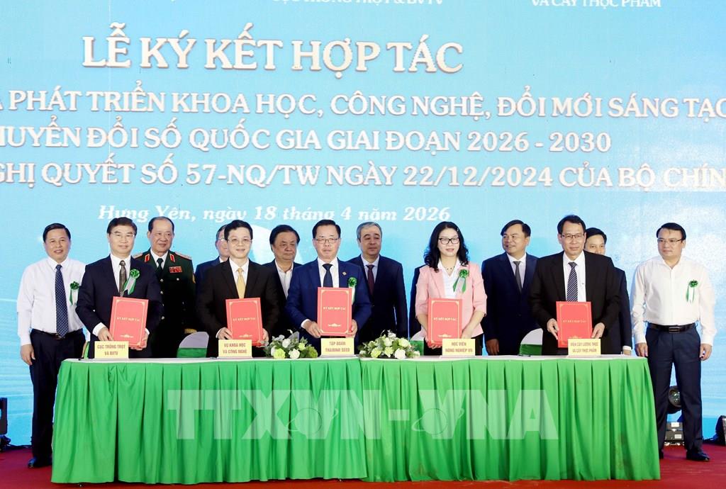 Lễ ký kết hợp tác 3 nhà (cơ quan quản lý nhà nước - doanh nghiệp - các tổ chức khoa học công nghệ) để triển khai các nội dung nghiên cứu khoa học, đổi mới sáng tạo và chuyển đổi số, thực hiện theo tinh thần Nghị quyết 57-NQ/TW của Bộ Chính trị. Ảnh: Thế Duyệt - TTXVN