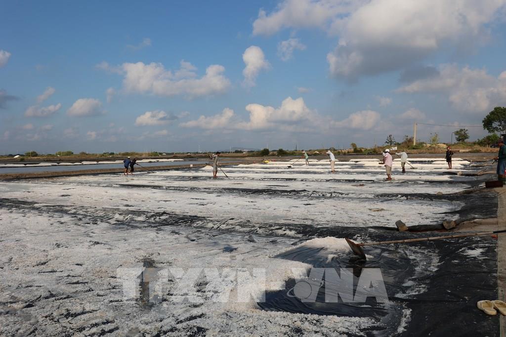 Diêm dân xã Long Điền cào muối trong những ngày nắng, khẩn trương thu hoạch những mẻ muối đầu vụ. Ảnh: Hoàng Nhị