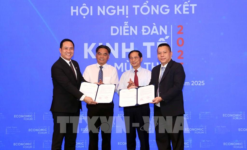 Phó Thủ tướng Chính phủ Bùi Thanh Sơn chứng kiến lễ trao văn bản hợp tác của doanh nghiệp hưởng ứng đưa các kiến nghị của Diễn đàn Kinh tế Mùa thu năm 2025 đi vào thực tiễn. Ảnh: Xuân Khu-TTXVN