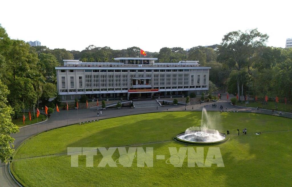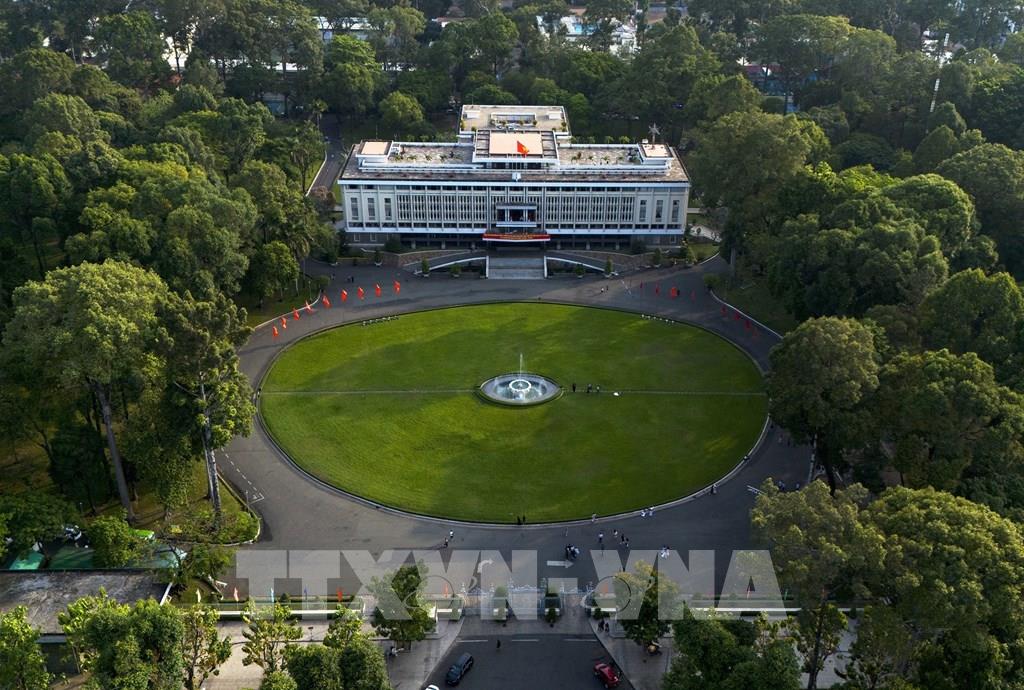 Di tích quốc gia đặc biệt Dinh Độc Lập, chứng tích lịch sử ngày 30/4/1975, nổi bật giữa không gian xanh. Ảnh: Hồng Đạt - TTXVN