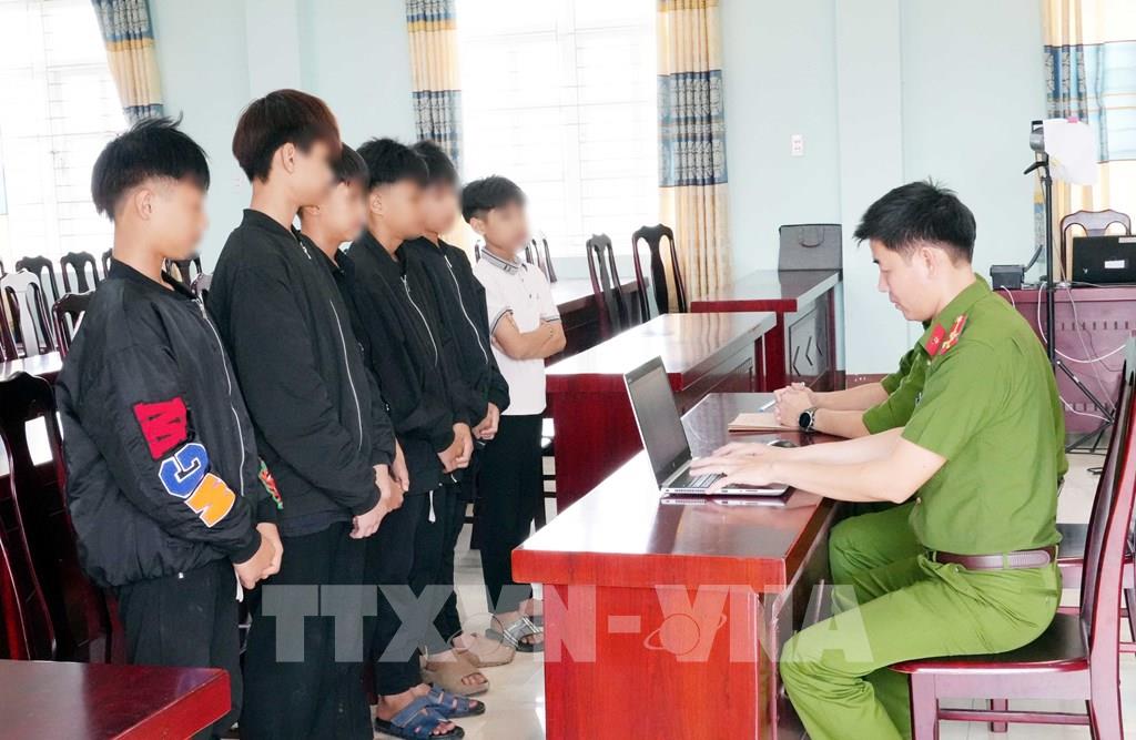Công an xã Bắc Trạch (Quảng Trị) làm việc, tuyên truyền nhắc nhở nhóm thanh thiếu nhi thực hiện hành vi ném đá vào xe tải trên cao tốc Bắc - Nam đêm 21/3. Ảnh: Tá Chuyên - TTXVN