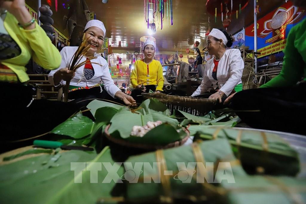 Gói bánh chưng trong những ngày Tết là một sinh hoạt cộng đồng không thể thiếu của người Mường. Ảnh: Trọng Đạt-TTXVN