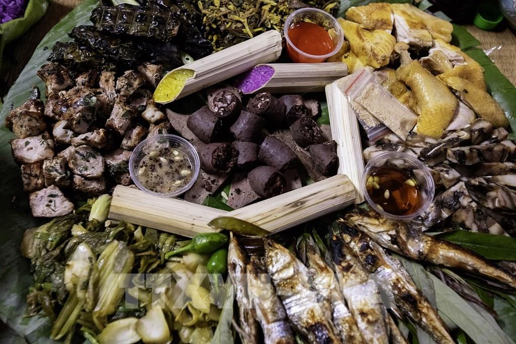 Mâm cỗ lá của người Mường đẩy đủ các món ăn dân tộc. Ảnh: Trọng Đạt-TTXVN