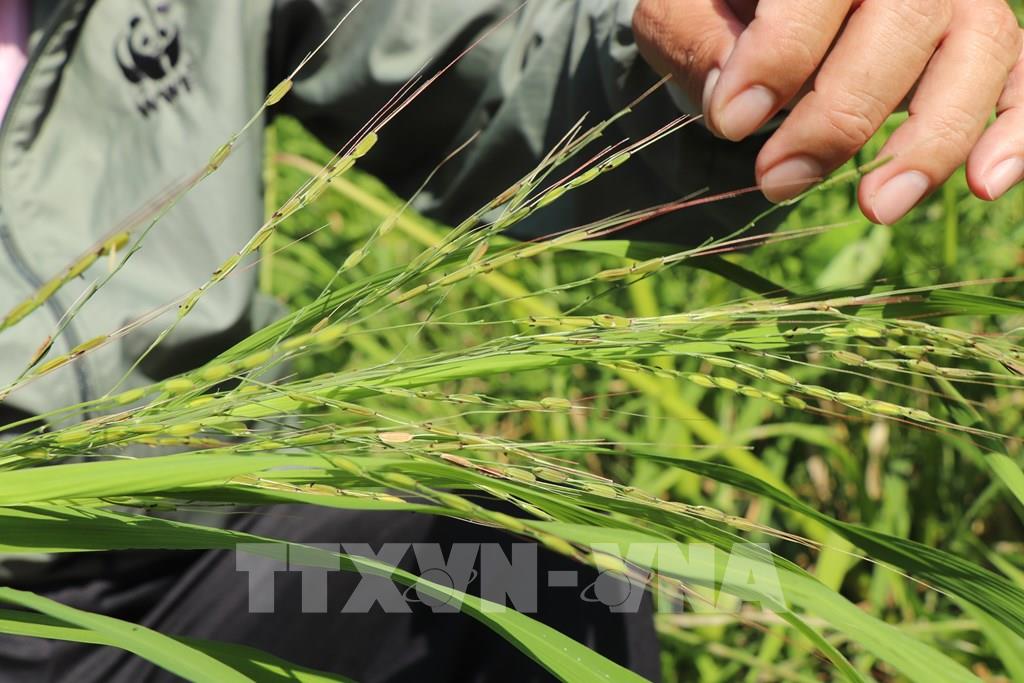 Các cán bộ Khu bảo tồn Lung Ngọc Hoàng (thành phố Cần Thơ) kiểm tra sinh trưởng của lúa hoang. Ảnh: Thu Hiền - TTXVN