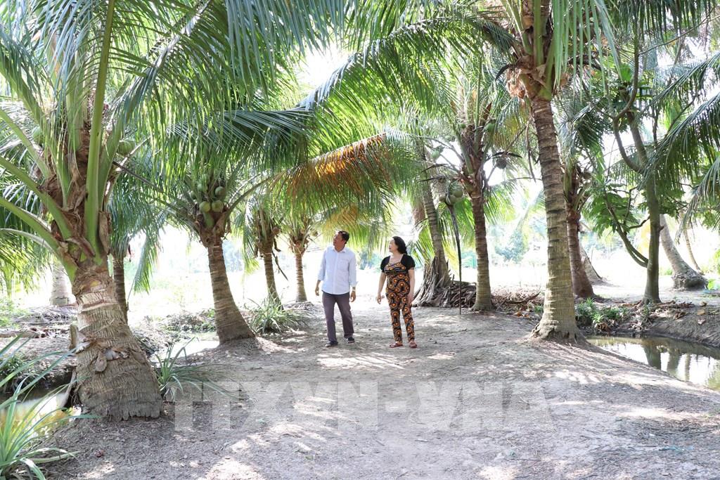 Vườn dừa hữu cơ của bà Nguyễn Thị Nhành tại ấp Phú Thọ II, xã Tiểu Cần, tỉnh Vĩnh Long. Ảnh: Thanh Hòa - TTXVN