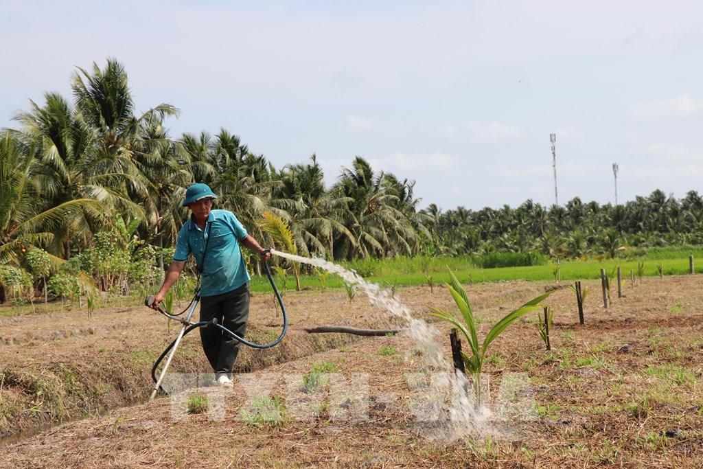 Nông dân xã Tiểu Cần (Vĩnh Long) chăm sóc vườn dừa mới trồng theo chuẩn hữu cơ. Ảnh: Thanh Hòa - TTXVN