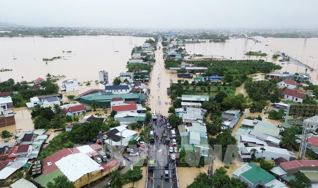 Mưa lũ gây ngập cục bộ trên tuyến quốc lộ 1 đoạn qua xã Suối Hiệp (Khánh Hòa). Ảnh: Nguyễn Thành - TTXVN