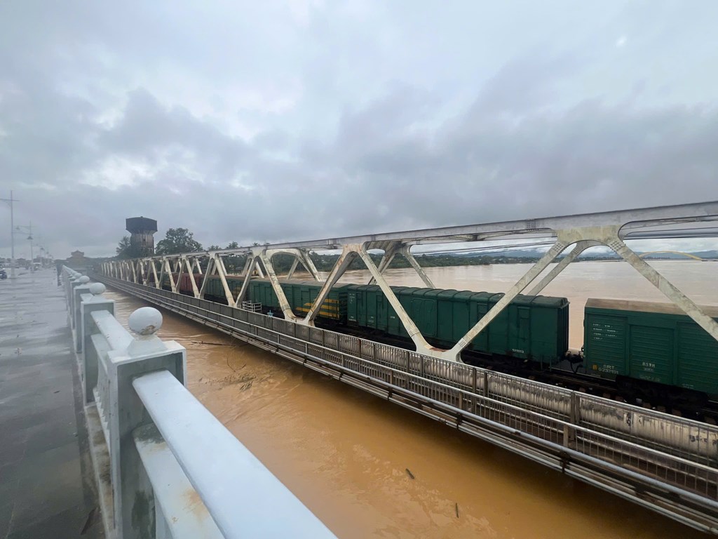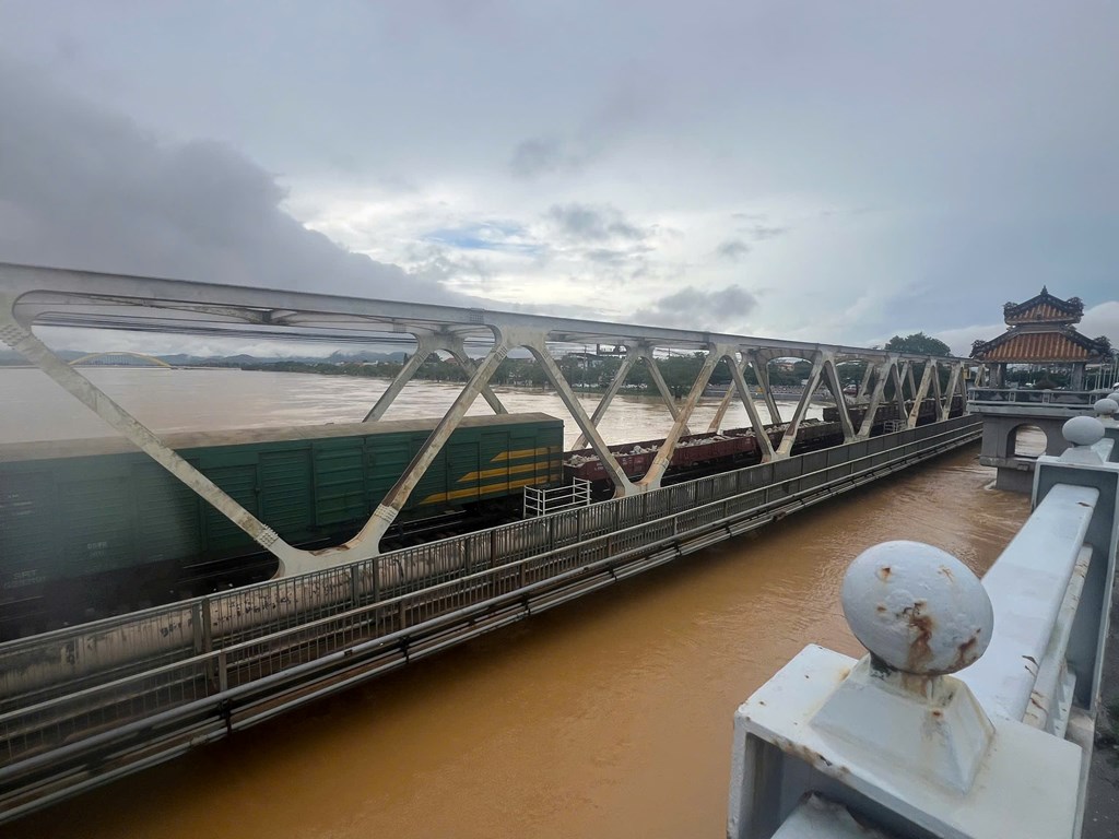 Ngành đường sắt điều tàu giữ cầu Bạch Hổ và Dã Viên khi mực nước sông Hương qua thành phố Huế lên chạm đáy cầu. Ảnh: Bnews/vnanet.vn phát