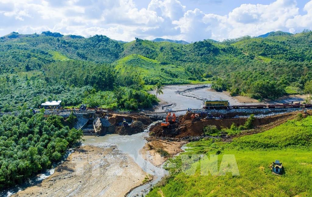 Để khắc phục sạt lở, nhà thầu đã khẩn trương mở đường công vụ nối từ Quốc lộ 19C vào khu vực sạt lở, tạo điều kiện cho xe tải vận chuyển vật liệu. Cùng với đó, các đoàn tàu chở đá và vật tư kỹ thuật cũng được bố trí chạy đến hai đầu sạt lở, rút ngắn thời gian cung ứng và đẩy nhanh tiến độ thi công. Công tác khảo sát, đo đạc địa hình tiếp tục được thực hiện song song để điều chỉnh giải pháp phù hợp, vừa đảm bảo kỹ thuật, vừa bảo đảm an toàn cho lực lượng thi công trong điều kiện địa chất phức tạp.Trong sáng ngày 9/11, nhiều hạng mục quan trọng sắp hoàn thành như: đổ bê tông gia cố mố cầu tạm, lắp dựng phần trụ và dầm thép. Lực lượng công nhân tiếp tục thay phiên nhau làm việc ngày đêm, đảm bảo tiến độ theo đúng kế hoạch.