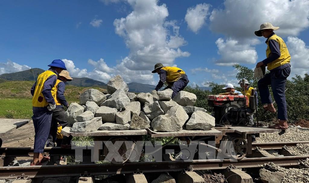 Công nhân thi công khắc phục sạt lở đường sắt. Ảnh: Tường Quân - TTXVN
