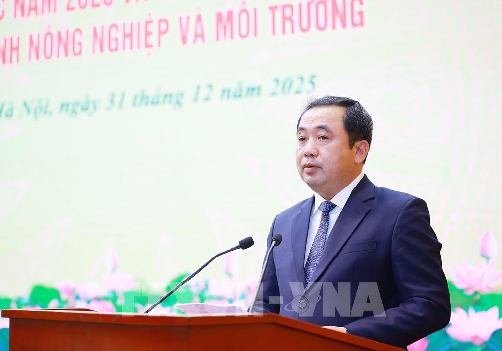 Bộ trưởng Bộ Nông nghiệp và Môi trường Trần Đức Thắng trình bày Báo cáo tổng kết năm 2025 và triển khai nhiệm vụ năm 2026 của ngành Nông nghiệp và Môi trường. Ảnh: Dương Giang-TTXVN