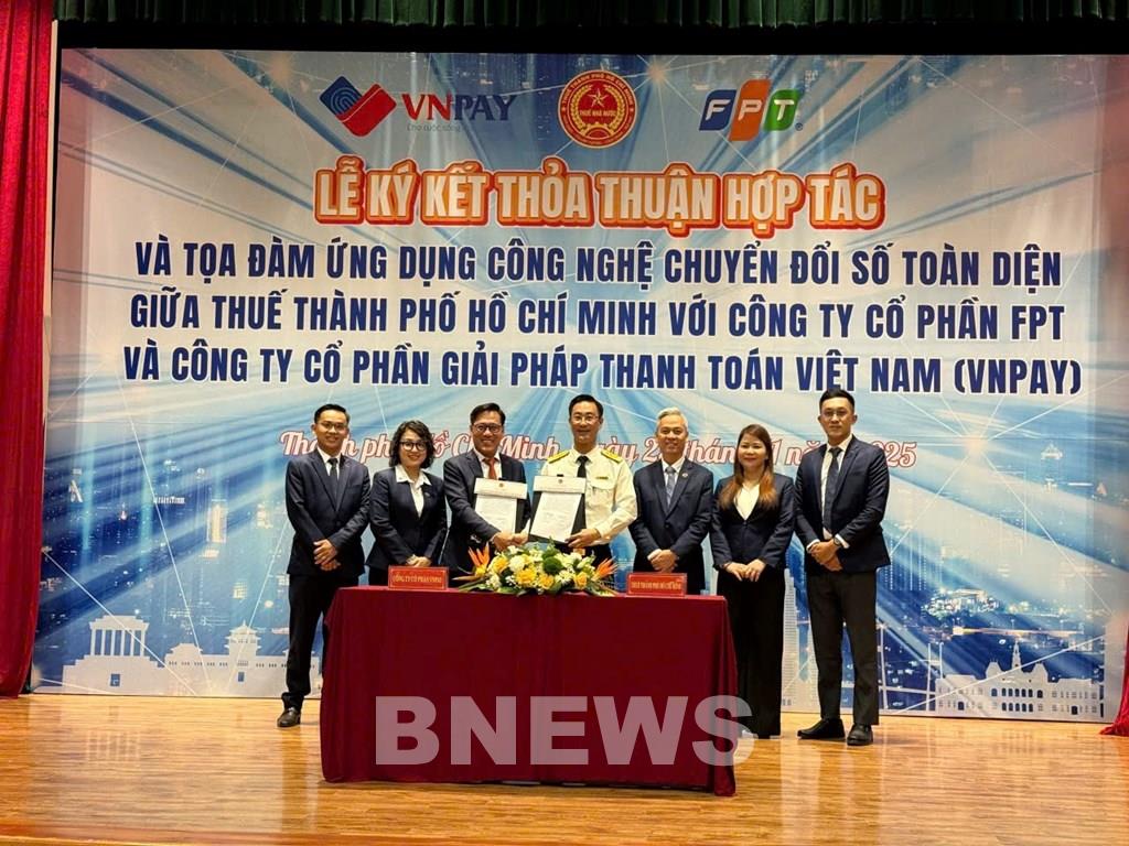Thuế TP. Hồ Chí Minh với Công ty cổ phần FPT và Công ty cổ phần Giải pháp Thanh toán Việt Nam (VNPay) ký thỏa thuận hợp tác. Ảnh: H.Chung/vnanet.vn