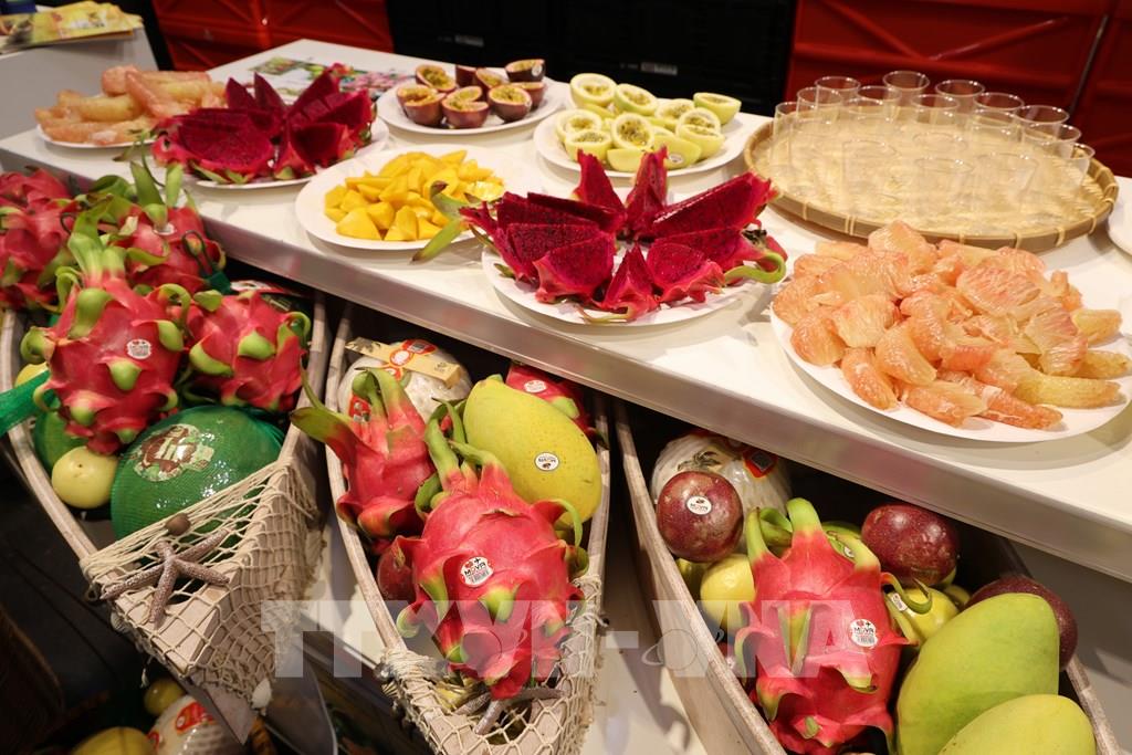 Sản phẩm trái cây tươi của Việt Nam được giới thiệu tới khách hàng Đức. Ảnh: Thu Hằng - Phóng viên TTXVN tại Đức