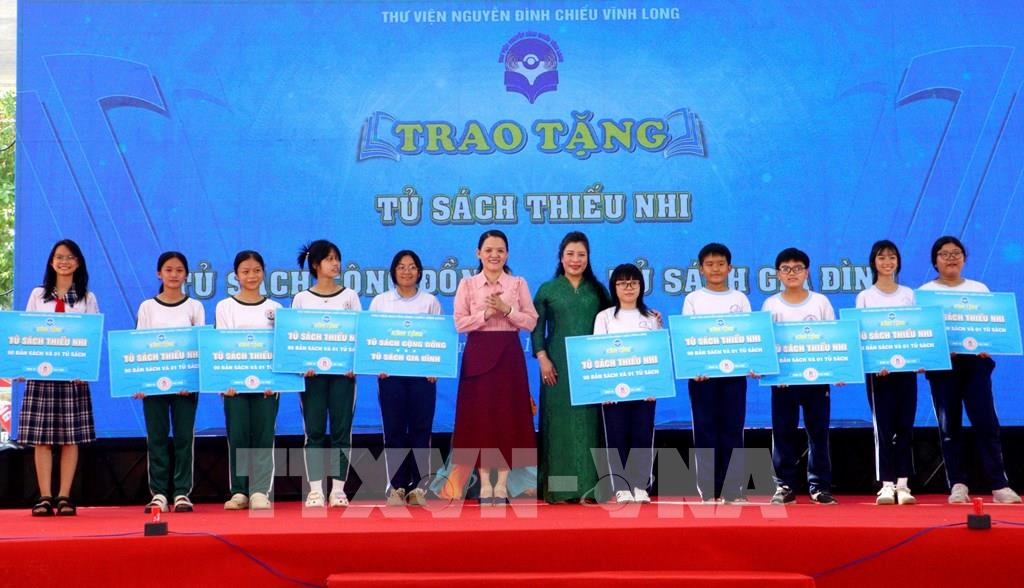Thư viện Nguyễn Đình Chiểu tỉnh Vĩnh Long trao tặng tủ sách cho bạn đọc thân thiết. Ảnh: Lê Thúy Hằng – TTXVN