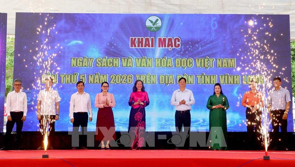 Đại biểu thực hiện nghi thức khai mạc Ngày Sách và Văn hóa đọc lần thứ 5 tại tỉnh Vĩnh Long. Ảnh: Lê Thúy Hằng – TTXVN