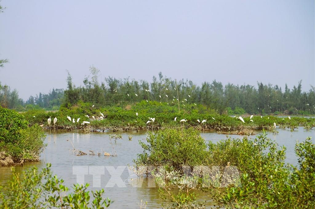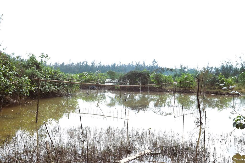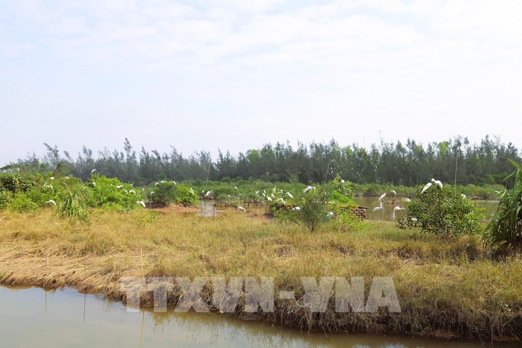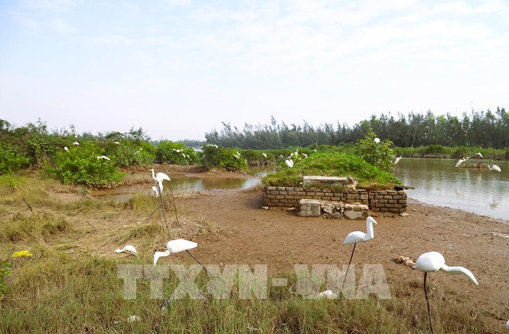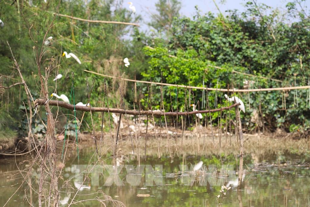 Khu vực rừng phi lao, rừng ngập mặn rộng lớn liền kề khu nuôi tôm trên địa bàn xã An Châu (tỉnh Nghệ An) xuất hiện hàng ngàn con cò giả bằng xốp được cắm với mật độ dày đặc. Ảnh: Xuân Tiến - TTXVN