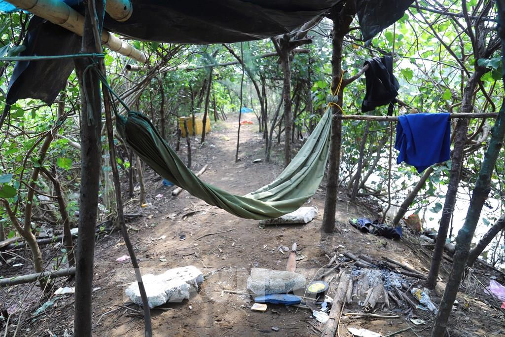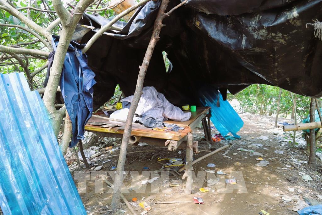 Một lều, lán tạm của thợ săn chim được lập nên trong khu vực rừng ngập mặn để săn chim và ngủ qua đêm. Ảnh: Xuân Tiến - TTXVN