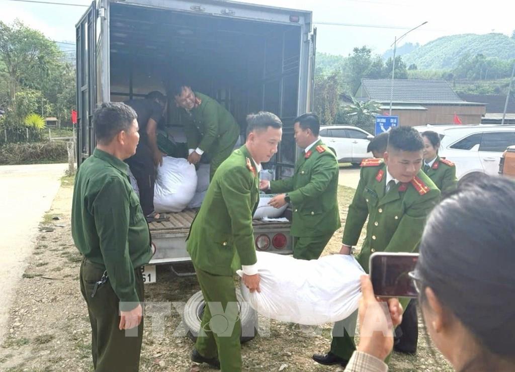 Cán bộ, chiến sĩ Công an xã Bình Chuẩn tiếp nhận, vận chuyển gạo vào địa điểm tập trung để trao tặng cho người nghèo, cận nghèo, gia đình có hoàn cảnh khó khăn trên địa bàn xã Bình Chuẩn (tỉnh Nghệ An). Ảnh: TTXVN phát