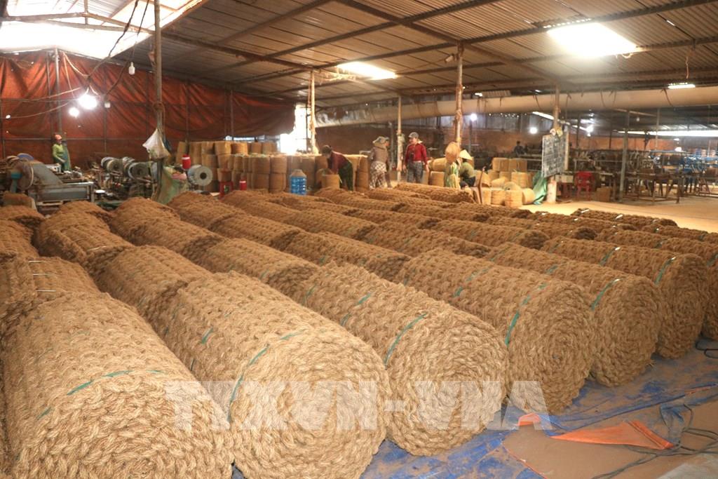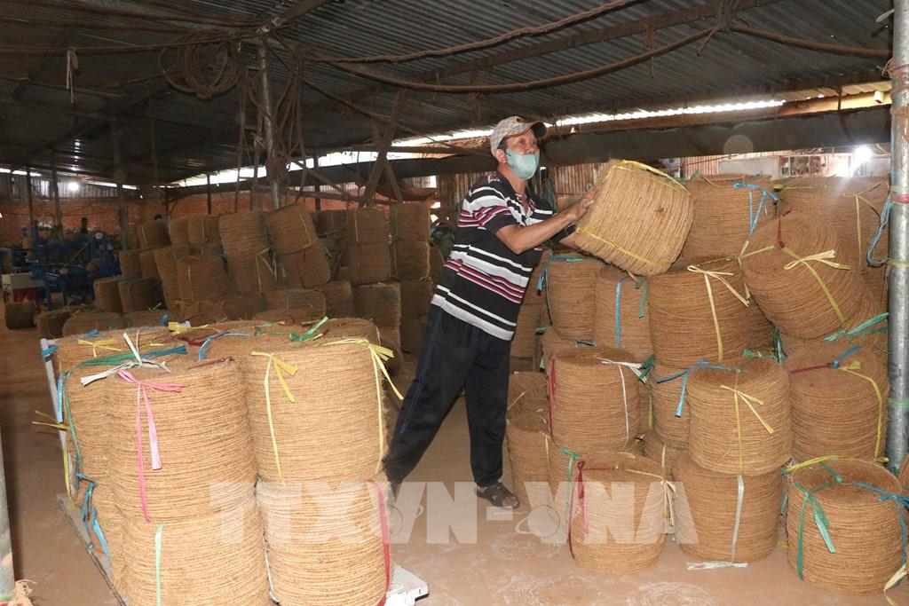 Vỏ dừa được tận dụng lấy xơ se chỉ, đan thảm tại xã Nhị Long– một mắt xích trong chuỗi kinh tế tuần hoàn từ cây dừa. Ảnh: Thanh Hòa- TTXVN