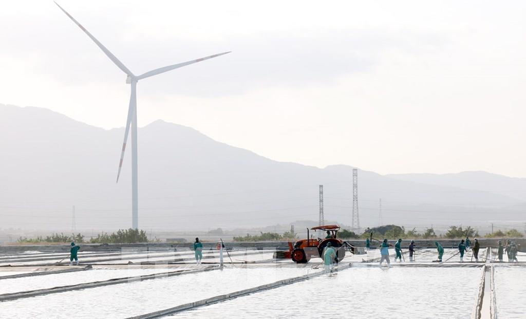 Các trụ điện gió được xây dựng trên cánh đồng muối ở xã Thuận Nam, tỉnh Khánh Hòa. Ảnh: Xuân Triệu - TTXVN