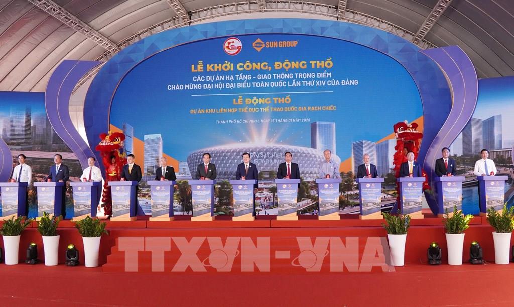 Lãnh đạo TP. Hồ Chí Minh và các đại biểu thực hiện nghi thức động thổ dự án Khu liên hợp Thể dục Thể thao Quốc gia Rạch Chiếc với tổng mức đầu tư hơn 145.000 tỷ đồng. Ảnh: Trung Tuyến – TTXVN
