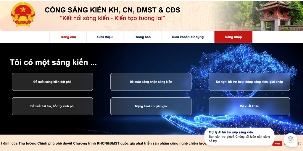 Giao diện Cổng Sáng kiến khoa học, công nghệ và đổi mới sáng tạo. Ảnh: sangkien.gov.vn