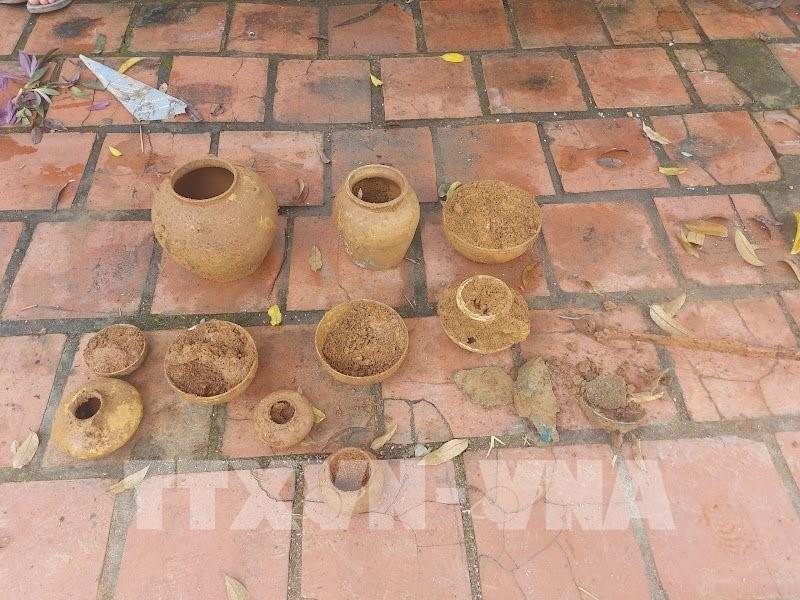 Di vật phát hiện được có 2 chiếc bình, 4 chiếc bát, 4 chiếc lọ bằng gốm và 1 số mảnh nhỏ khác bằng các chất liệu gốm, đồng, sắt... Ảnh: Hoa Mai - TTXVN