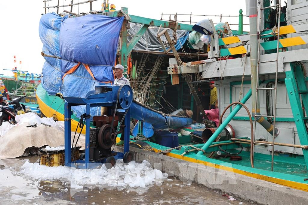 Ngư dân xã Bình Châu chuyển đá lên tàu cá để chuẩn bị xuất bến, ra khơi đầu năm sáng 25/2/2026 (mồng 9 Tết). Ảnh: Hoàng Nhị - TTXVN