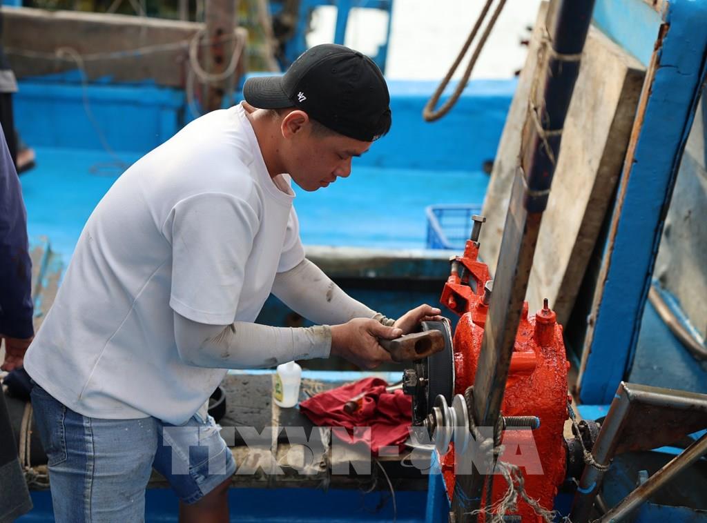 Ngư dân xã Phước Hải kiểm tra máy móc trên tàu cá trước khi xuất bến ra khơi đầu năm. Ảnh: Hoàng Nhị - TTXVN