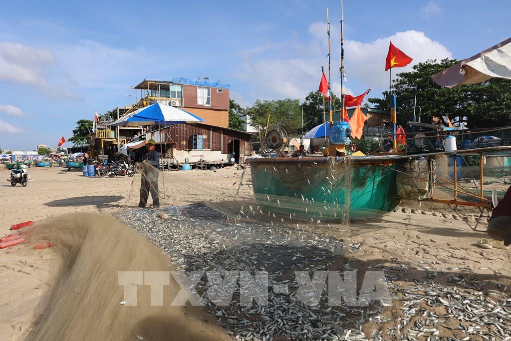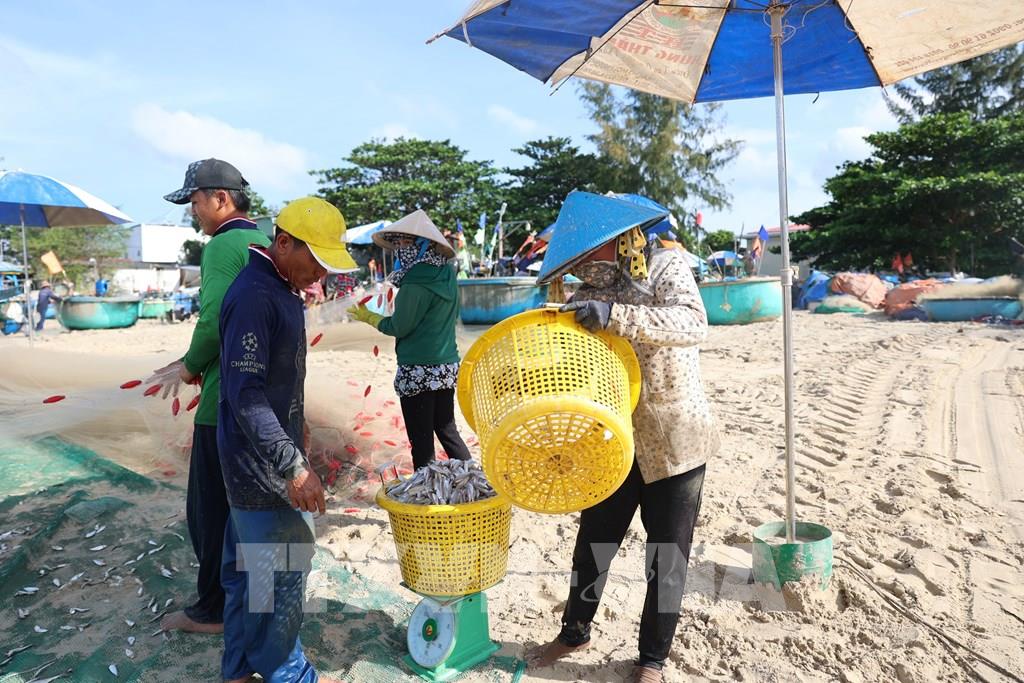 Những mẻ cá sau khi được ngư dân xã Long Hải giũ ra khỏi lưới đã được thương lái thu mua ngay tại chỗ. Ảnh: Hoàng Nhị - TTXVN