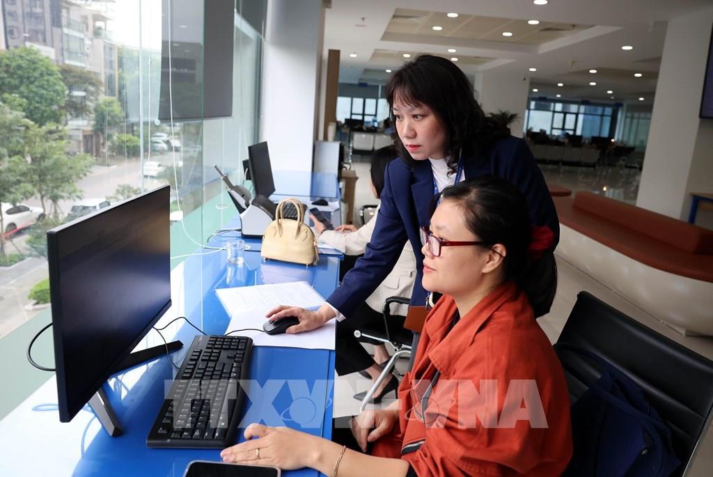 Cán bộ Trung tâm Phục vụ hành chính công thành phố Hà Nội thực hiện giải quyết thủ tục hành chính cho người dân. Ảnh: Vũ Quang – TTXVN