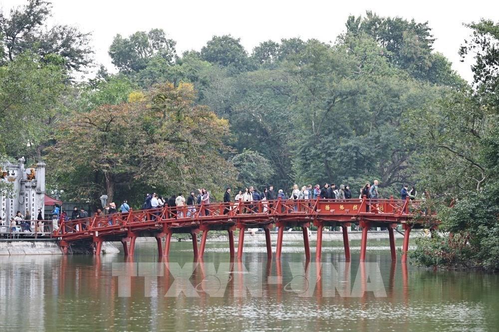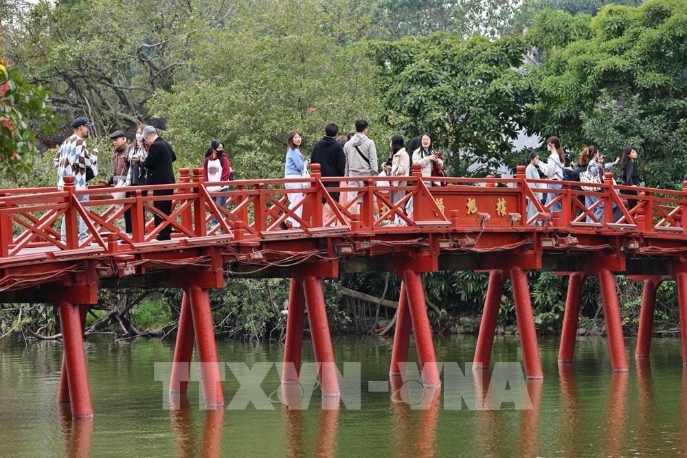 Cầu Thê Húc vào đền Ngọc Sơn tấp nập du khách trong và ngoài nước. Ảnh: Minh Đức – TTXVN