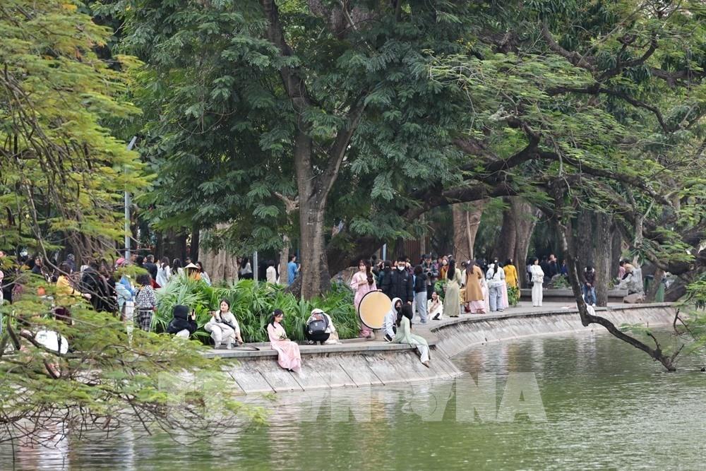 Hồ Văn nằm trong quần thể di tích Quốc gia đặc biệt Văn Miếu - Quốc Tử Giám thu hút đông đảo du khách quốc tế đến tham quan trong ngày nghỉ lễ. Ảnh: Minh Đức – TTXVN
