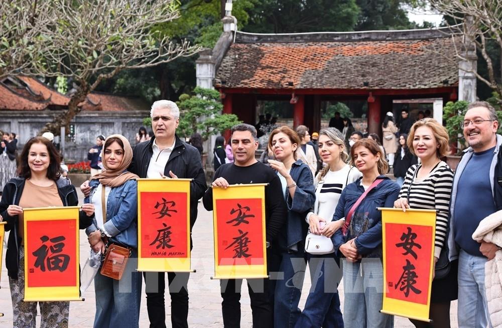 Du khách Thủ đô và nước ngoài tham quan, tìm hiểu nét đẹp xin chữ và cho chữ tại di tích Văn Miếu – Quốc Tử Giám trong dịp nghỉ lễ. Ảnh: Minh Đức – TTXVN