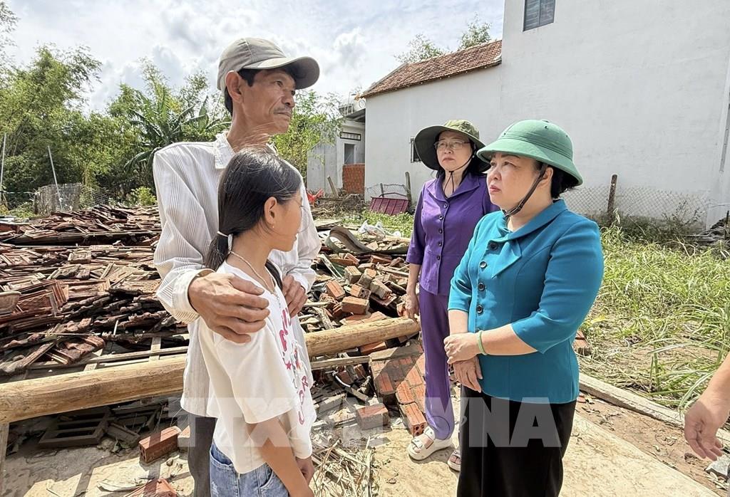 Phó Bí thư Thường trực Tỉnh ủy, Chủ tịch HĐND tỉnh Đắk Lắk Cao Thị Hòa An thăm, động viên người dân vùng lũ tại xã Phú Hòa 1. Ảnh: Tường Quân – TTXVN