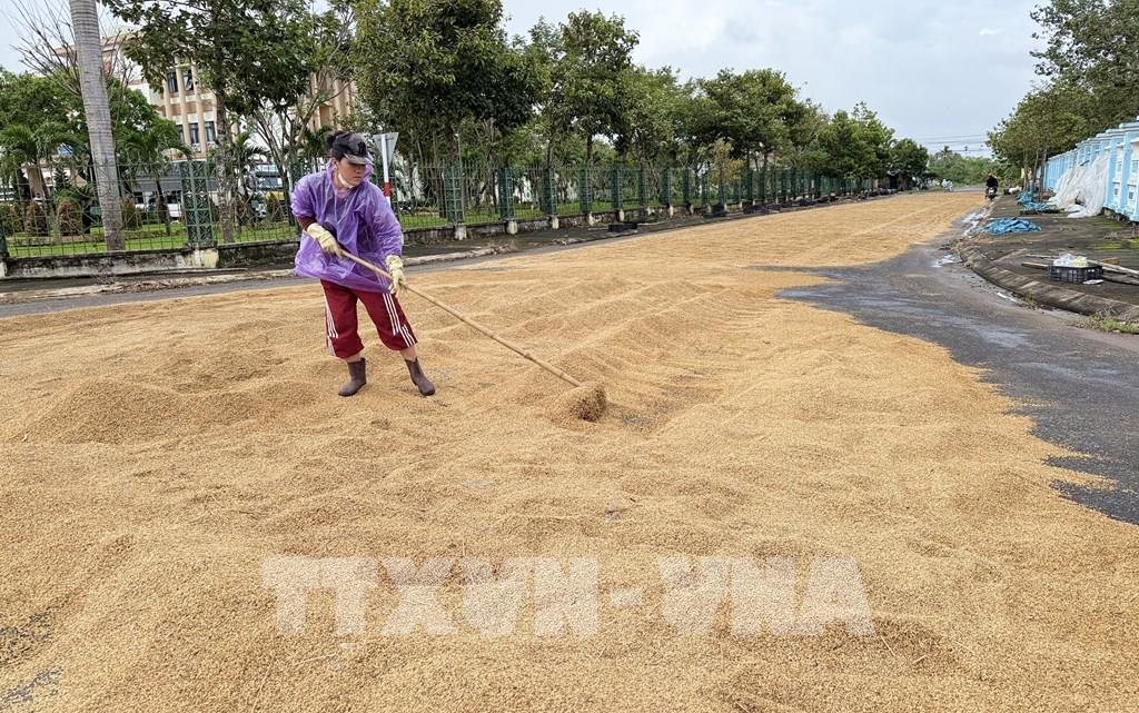 Người dân xã Tây Hòa đem lúa bị hư hại do mưa lũ ra phơi để tận dụng chăn nuôi. Ảnh: Tường Quân – TTXVN