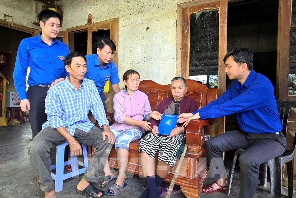 Đoàn công tác Trung ương Đoàn Thanh niên Cộng sản Hồ Chí Minh thăm, tặng quà người dân vùng lũ xã Tuy An Đông. Ảnh: Tường Quân – TTXVN