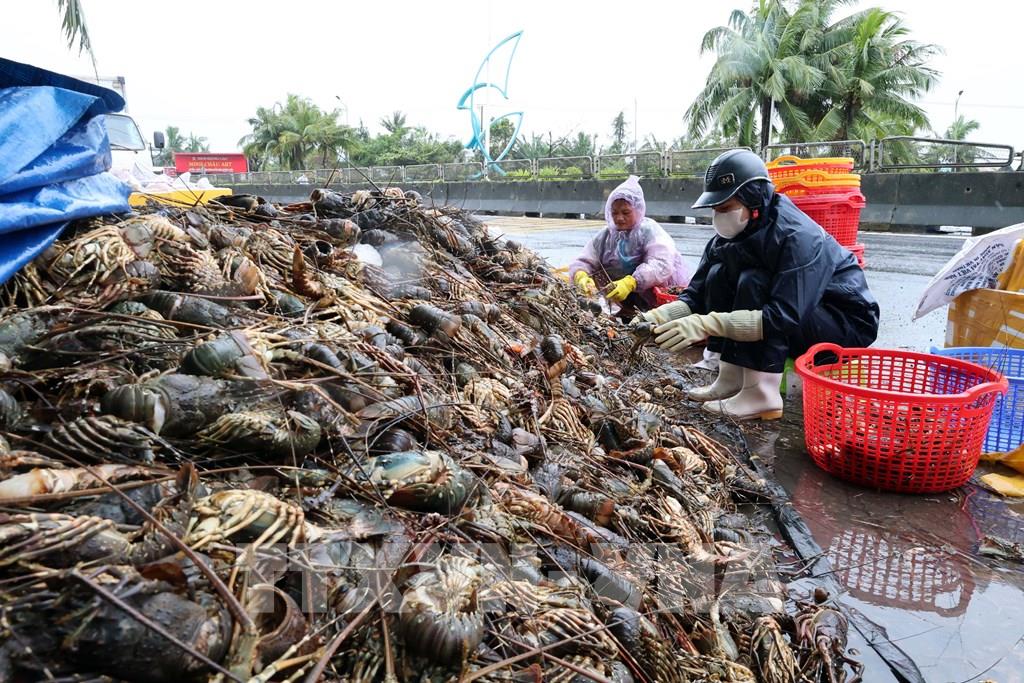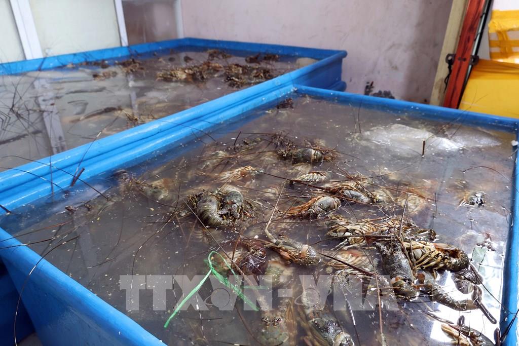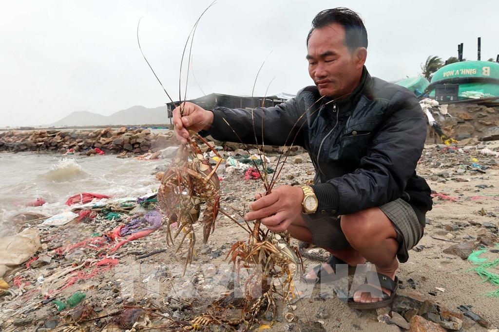 Tôm hùm đang trong giai đoạn chuẩn bị thu hoạch bị chết hàng loạt do nước lũ. Ảnh: Đỗ Trưởng – TTXVN