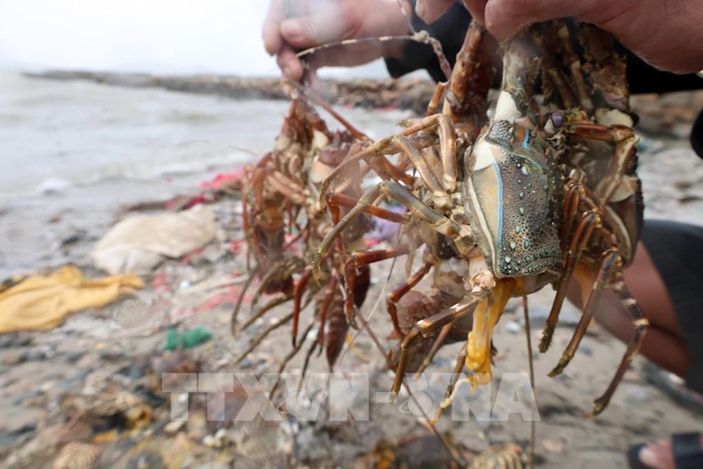 Tôm hùm đang trong giai đoạn chuẩn bị thu hoạch bị chết hàng loạt do nước lũ. Ảnh: Phạm Kha – TTXVN