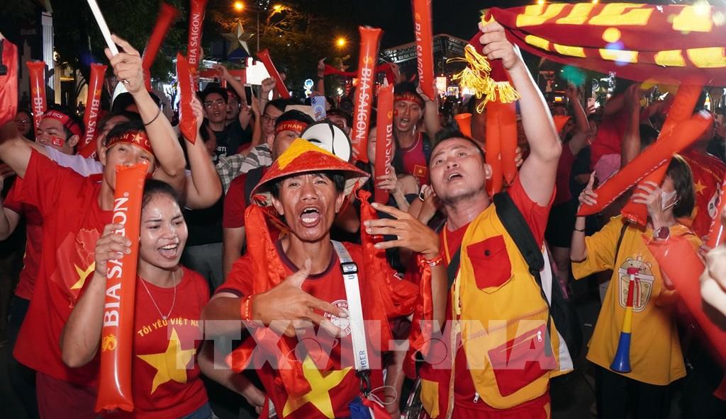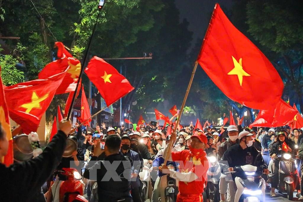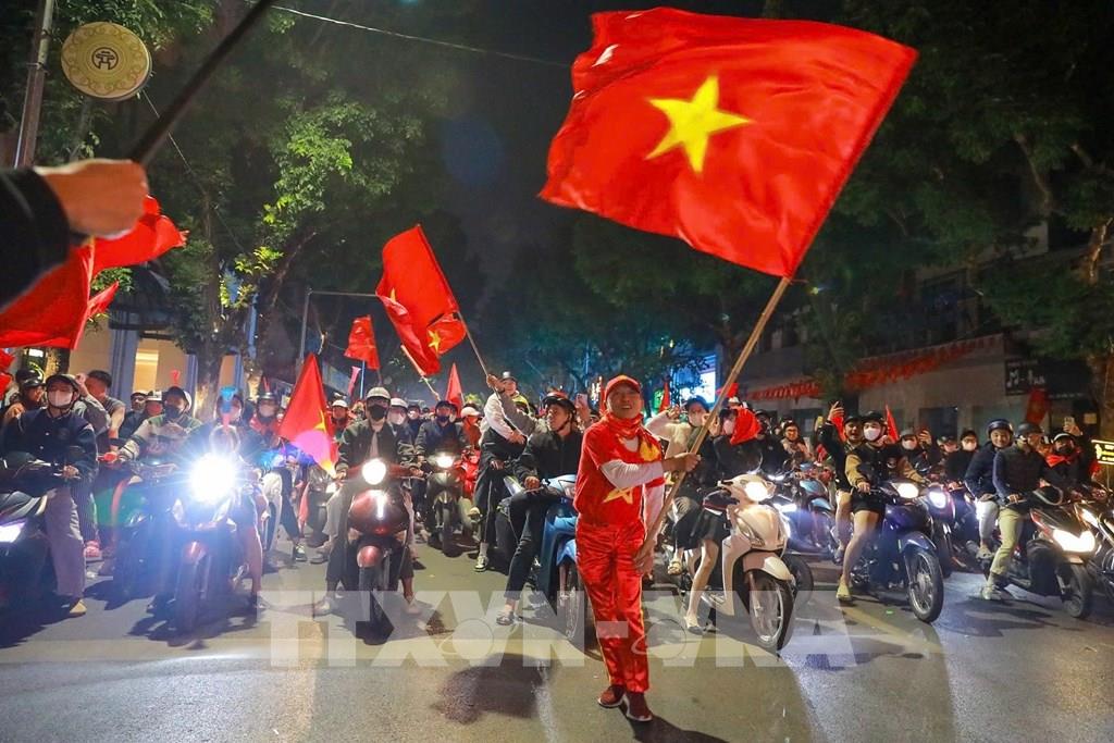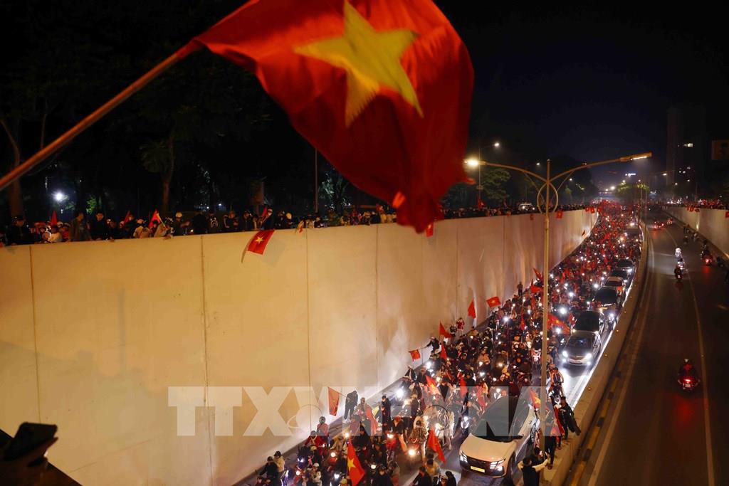 Cổ động viên đổ ra đường mừng chiến thắng tại khu vực hầm Kim Liên hướng về Xã Đàn. Ảnh: Phạm Kiên - TTXVN