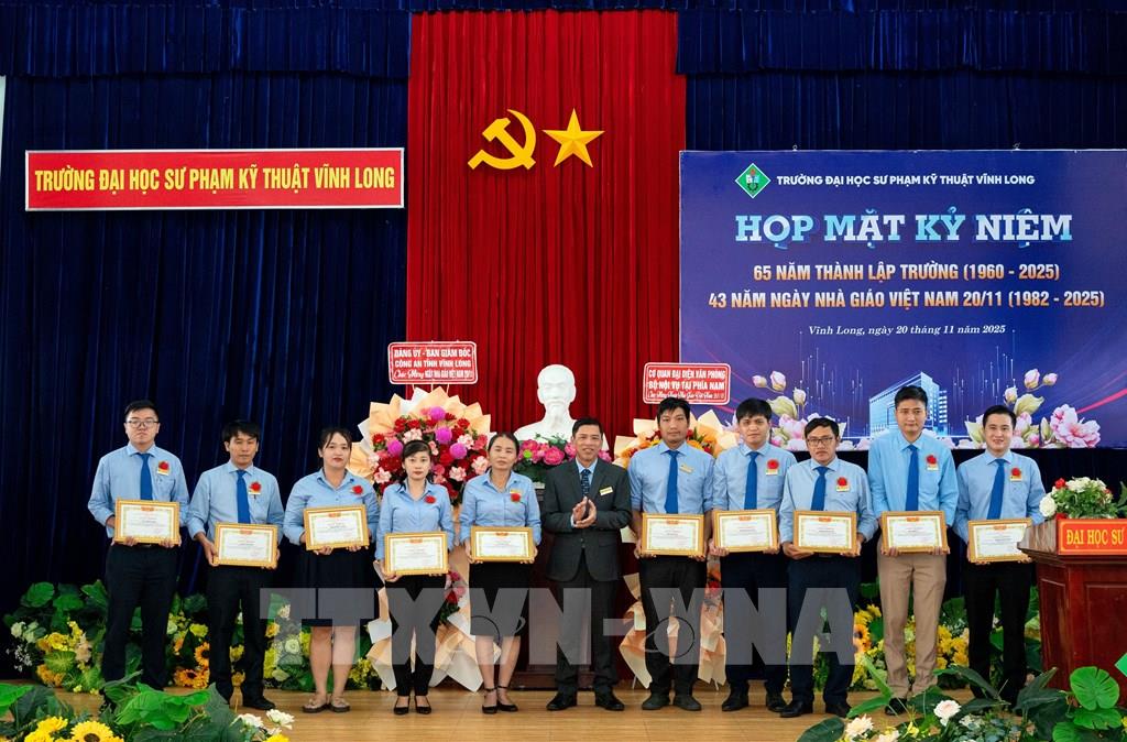 PGS.TS Nguyễn Thanh Tùng trao giấy khen cho các giảng viên có thành tích xuất sắc trong công tác hướng dẫn sinh viên đạt giải tại các cuộc thi trong lễ kỷ niệm 43 năm Ngày Nhà giáo Việt Nam 20/11. Ảnh: Phúc Sơn - TTXVN