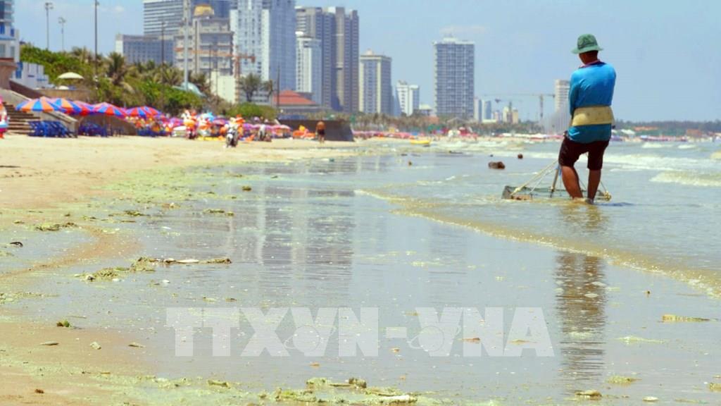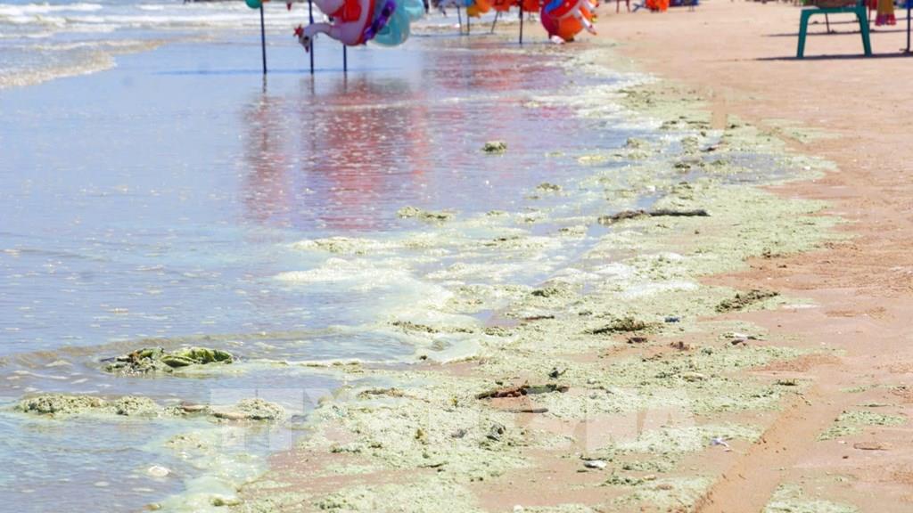 Tảo kết thành mảng trôi dạt vào bãi tắm bãi Sau ở Vũng Tàu. Ảnh: TTXVN phát
