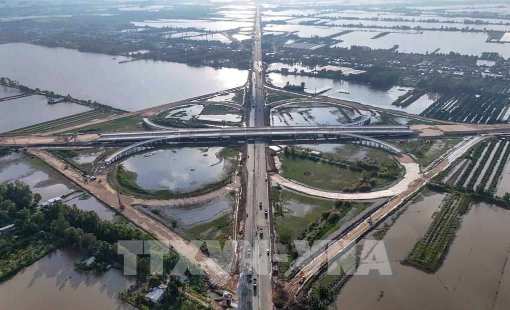 Nút giao IC4 với thiết kế hình cánh bướm trên tuyến cao tốc Cần Thơ – Cà Mau với các vòng nhánh lên, xuống đã hình thành rõ ràng. Hạ tầng cầu, đường dẫn và taluy cơ bản hoàn chỉnh. Ảnh: Thanh Liêm - TTXVN
