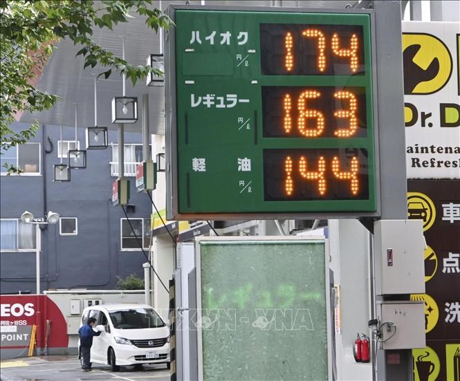 Giá xăng được niêm yết tại trạm xăng ở Tokyo, Nhật Bản. Ảnh: Kyodo/ TTXVN