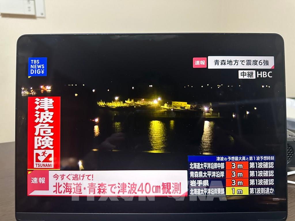 Theo phóng viên TTXVN tại Tokyo, sau trận động đất mạnh có độ lớn 7,6 xảy ra lúc nửa đêm ngày 8/12 tại khu vực biển ngoài khơi tỉnh Aomori, Đông Bắc Nhật Bản, cơ quan chức năng Nhật Bản đã ghi nhận sóng thần xuất hiện ở khu vực ven biển từ tỉnh Hokkaido đến vùng Tohoku với chiều cao sóng 70 cm tại cảng Kuji, tỉnh Iwate và 50 cm tại thị trấn Urakawa, tỉnh Hokkaido.