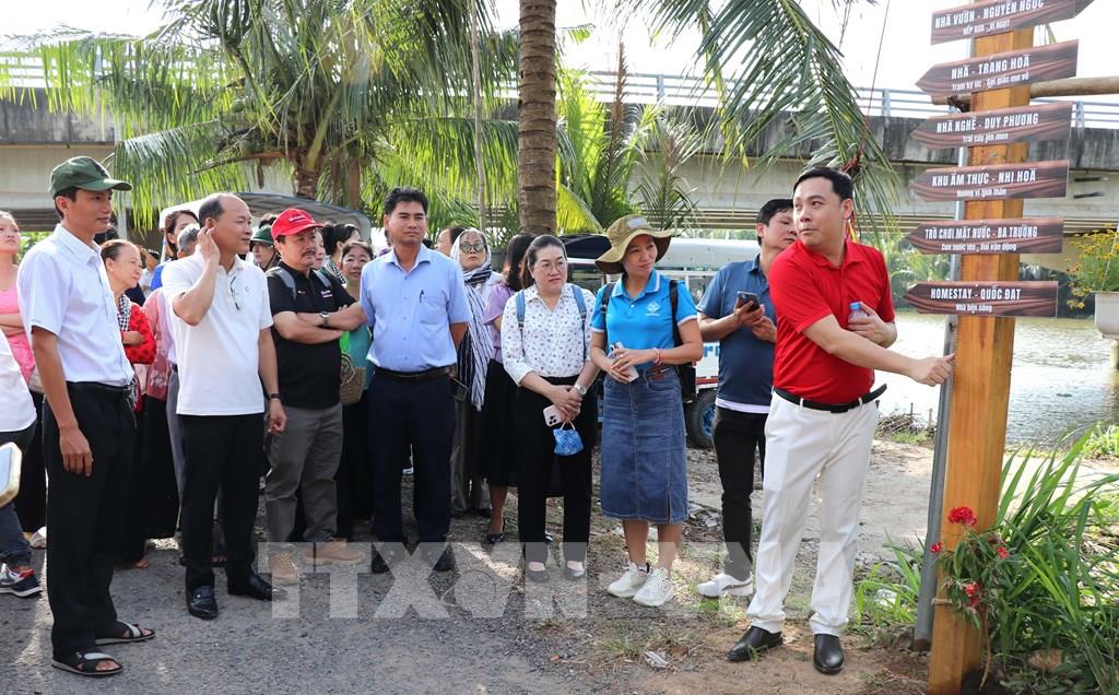 Khách tham quan tìm hiểu các dịch vụ tại mô hình du lịch nông thôn Nhị Hòa. Ảnh: Thanh Hòa - TTXVN